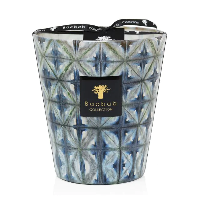 The Kilan scented candle is made in a glass with a shiny effect that allows the flame to shine through. The graphic pattern that covers the glass, whose texture is similar to parchment, is a delicate blend of blue-gray and celadon green.