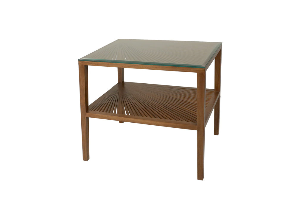 Beautiful, hand made from natural woods (teak and mahogany), this side table has a delicate fan designed top and bottom shelf. This larger design is perfect for a side table with a second shelf offering additional storage. All tables come with glass to protect delicate fan top wood work.