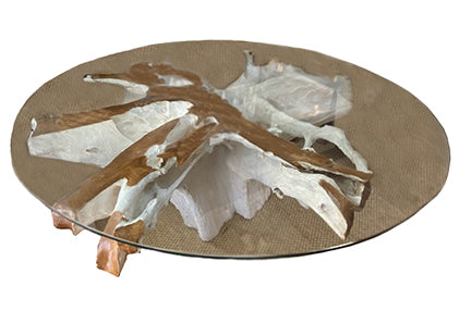 This stunning dining table is made from natural teak root. It is bleached white with hand applied brown stain to the raw edges.
