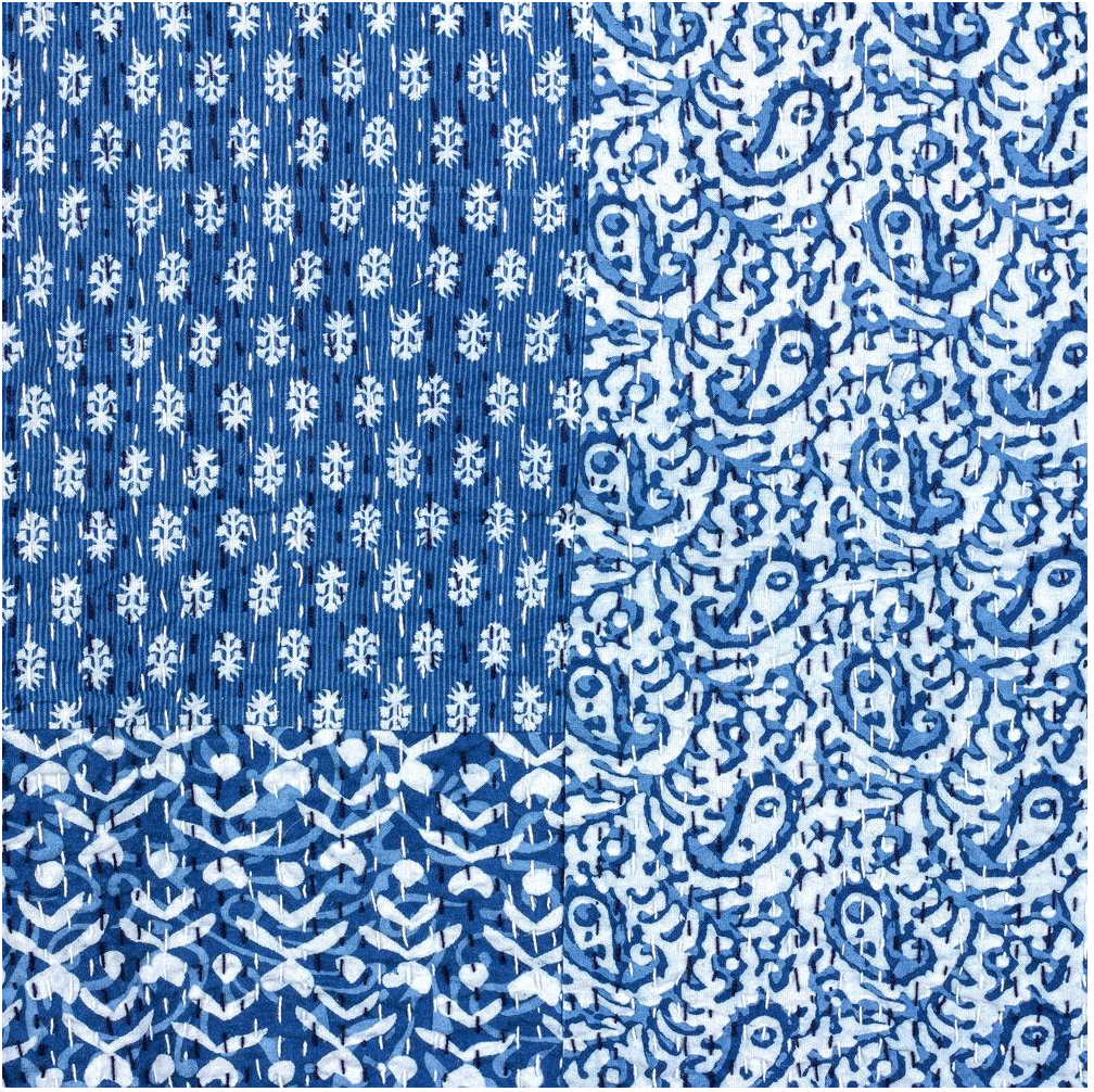 This beautiful indigo block print quilt is 100% ethically made in India. The quilt is made using the Kantha method, is a traditional small running stitch popular in India. The pattern is applied using a carved wood block.