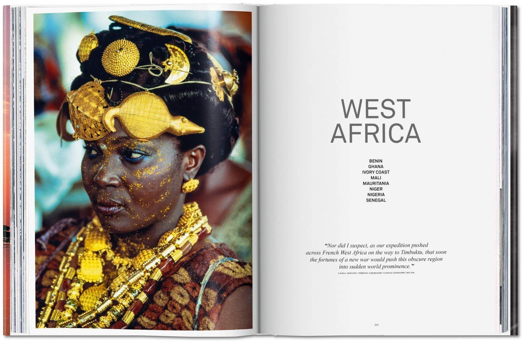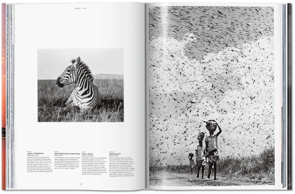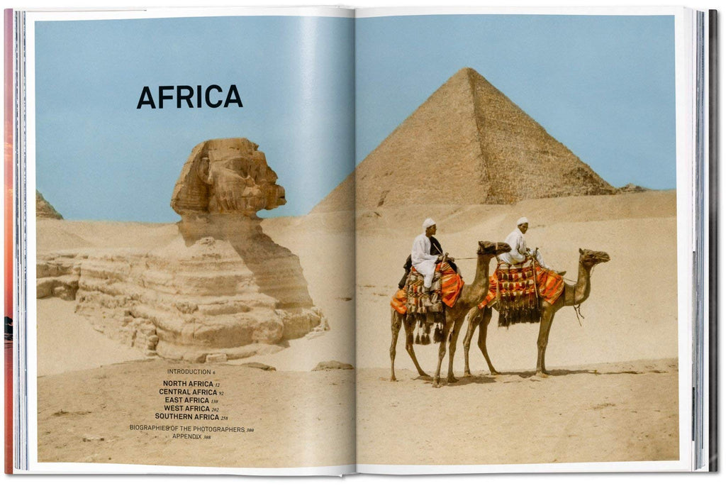 Our continental journey through amazing Africa ranges from evocative early black-and-white pictures to autochromes, from the golden age of Kodachromes to digital. Along the way, we fly over the misty volcanoes of Uganda in a 1950s plane; follow archaeologists into the cool, musky tombs of Egypt; gaze up at the gleaming skyscrapers of Zimbabwe; admire the ritual masks of the Chokwe tribesmen of Angola; get lost in a labyrinth of alleys and souks in Algeria’s old quarters; wonder at the fragile red-tufted flowers of South Africa’s Drakensberg mountains; trudge behind Kenyan farmers as they battle clouds of flying locusts; and gingerly spy mountain gorillas enjoying the Rwandan sunshine.