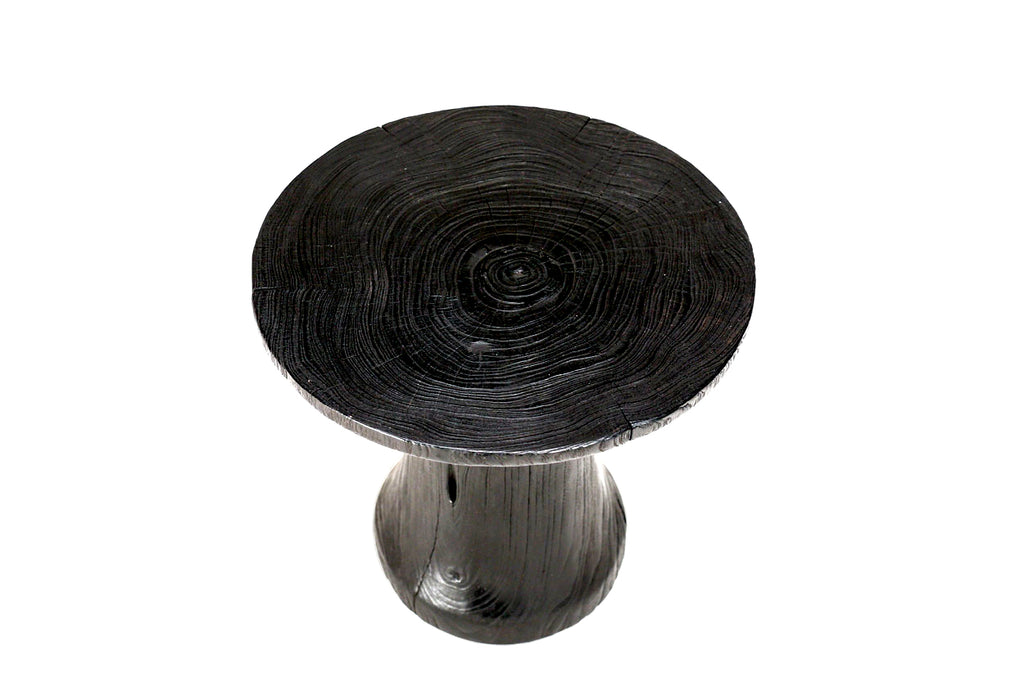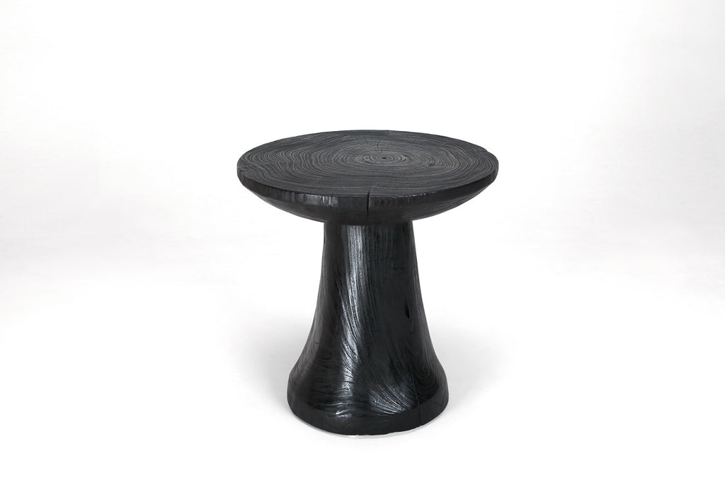 This pitch black ebony finished teak table is a perfect blend of primitive charm and modern elegance. Its sleek design fits well with contemporary decor, yet on closer inspection reveals character from antiquity. This table exemplifies how modern design can harmoniously incorporate elements of the past, creating a unique piece that stands out in any setting.
