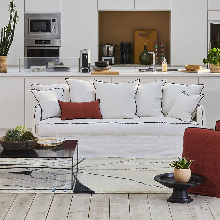 Elevate your living space with our Martinique French linen sofa, a perfect blend of provincial charm and Parisian-luxury. Handcrafted in France, it features feather cushions, French-loomed linen, a removable slipcover, and double-stitched detailing. Experience the epitome of relaxation and elegance with this stunning piece.