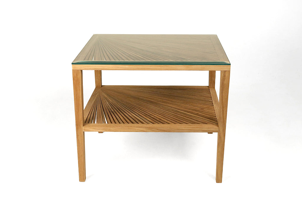 Beautiful, hand made from natural woods (teak and mahogany), this side table has a delicate fan designed top and bottom shelf. This larger design is perfect for a side table with a second shelf offering additional storage. All tables come with glass to protect delicate fan top wood work.