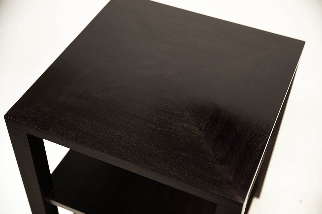 Beautiful square drink table with double shelves. Minimalistic design with maximum style and storage space. Available in natural teak wood or finished with a hand applied ebony stain. Two sizes