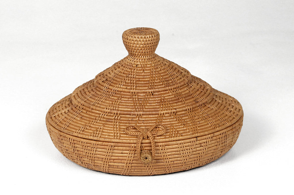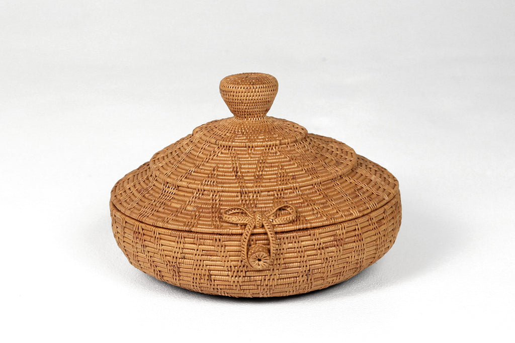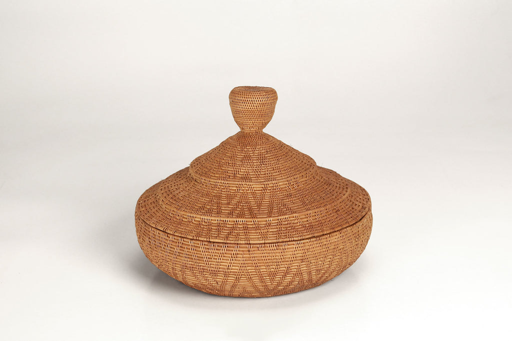 Handmade, uniquely tight weave, great for small spaces and items, smoked over coconut husks for distinct caramel coloration.
